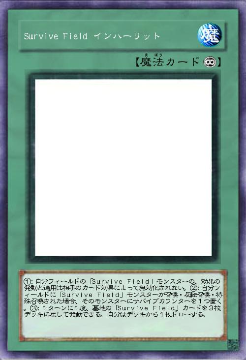 | ①:自分フィールドの「Survive Field」モンスターの、効果の発動と適用は相手のカード効果によって無効化されない。②:自分フィールドに「Survive Field」モンスターが召喚・反転召喚・特殊召喚された場合、そのモンスターにサバイブカウンターを1つ置く。③:1ターンに1度、墓地の「Survive Field」カードを3枚デッキに戻して発動できる。自分はデッキから1枚ドローする。 | |||