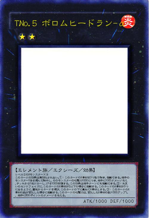 | レベル2のXモンスター×3 このカードの効果は無効化されない。①:このカードのX素材を3つ取り除き、発動できる。相手のモンスター1体を選んで除外し、そのモンスターの攻撃力1000につき、相手に1000ダメージ与え、デッキから1枚ドローし、LPを1000回復する。この効果は相手ターンにも発動できる。②:お互いのエンドフェイズに、このカードのX素材が2以下の場合に発動する。このカードのX素材が3つになるように、墓地からカードを選び、このカードの下に重ねてX素材とする。③:このカードのX素材の数が変化した場合に発動する。このカードの攻撃力は、変化したX素材の数×500アップし、相手に800ポイントのダメージを与える。 | |||