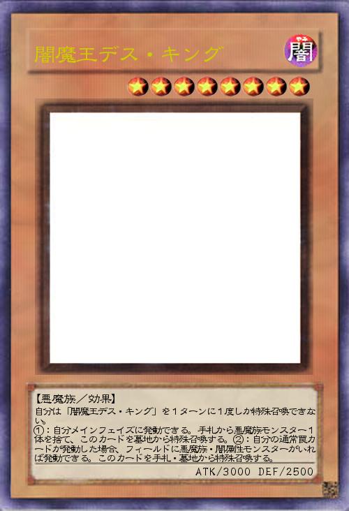 | 自分は「闇魔王デス・キング」を1ターンに1度しか特殊召喚できない。 ①:自分メインフェイズに発動できる。手札から悪魔族モンスター1体を捨て、このカードを墓地から特殊召喚する。②:自分の通常罠カードが発動した場合、フィールドに悪魔族・闇属性モンスターがいれば発動できる。このカードを手札・墓地から特殊召喚する。 | |||
