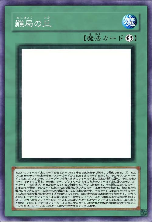 | お互いのフィールド上のカードを全てターン終了時まで裏側表示で除外して発動できる。①:お互いに自身のデッキの上からモンスターカードが3枚出るまでカードをめくり、そのモンスターカード3枚をエクストラモンスターゾーンを除く自身のフィールド上の任意の場所に置く。それ以外のカードはデッキに戻す。その後、ターンプレイヤーから順に自身がフィールド上に置いたモンスターカード1枚を選び、自身が使用していない隣接するゾーンに移動する。その際にお互いのカードが重なった場合、そのカードに記された攻撃力の低い方のカードは裏側表示で除外し、記された攻撃力の高い方のカードに記された攻撃力は、この効果の適用中、そのカードに重なった相手のカードに記された攻撃力の数値分下げた数値として扱う。同じ場合は両方裏側表示で除外する。どちらかのプレイヤーがフィールド上に置いたカードが全てフィールド上から離れるまでこの効果を繰り返し、ど | |||