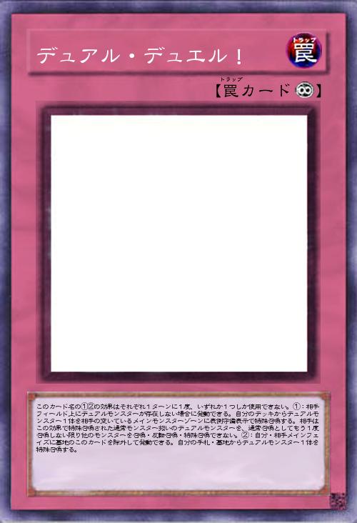 | このカード名の①②の効果はそれぞれ1ターンに1度、いずれか1つしか使用できない。①:相手フィールド上にデュアルモンスターが存在しない場合に発動できる。自分のデッキからデュアルモンスター1体を相手の空いているメインモンスターゾーンに表側守備表示で特殊召喚する。相手はこの効果で特殊召喚された通常モンスター扱いのデュアルモンスターを、通常召喚としてもう1度召喚しない限り他のモンスターを召喚・反転召喚・特殊召喚できない。②:自分・相手メインフェイズに墓地のこのカードを除外して発動できる。自分の手札・墓地からデュアルモンスター1体を特殊召喚する。 | |||