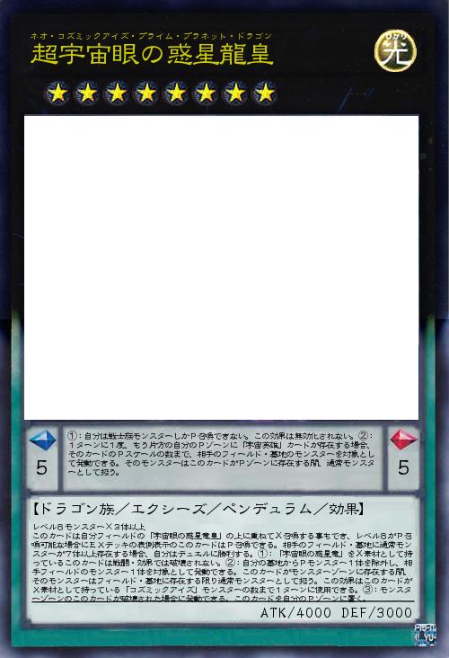 | レベル8モンスター×3体以上 このカードは自分フィールドの「宇宙眼の惑星竜皇」の上に重ねてⅩ召喚する事もでき、レベル8がP召喚可能な場合にEXデッキの表側表示のこのカードはP召喚できる。相手のフィールド・墓地に通常モンスターが7体以上存在する場合、自分はデュエルに勝利する。①:「宇宙眼の惑星竜」をⅩ素材として持っているこのカードは戦闘・効果では破壊されない。②:自分の墓地からPモンスター1体を除外し、相手フィールドのモンスター1体を対象として発動できる。このカードがモンスターゾーンに存在する間、そのモンスターはフィールド・墓地に存在する限り通常モンスターとして扱う。この効果はこのカードがX素材として持っている「コズミックアイズ」モンスターの数まで1ターンに使用できる。③:モンスターゾーンのこのカードが破壊された場合に発動できる。このカードを自分のPゾーンに置く。 | |||