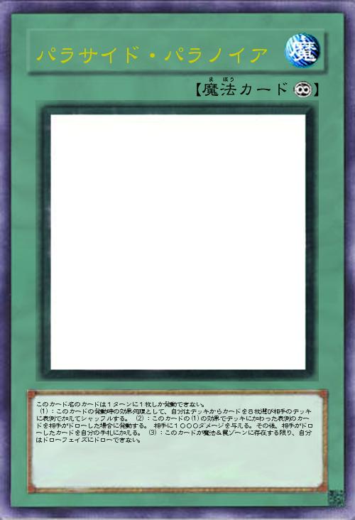 | このカード名のカードは1ターンに1枚しか発動できない。 (1):このカードの発動時の効果処理として、自分はデッキからカードを8枚選び相手のデッキに表側で加えてシャッフルする。 (2):このカードの(1)の効果でデッキに加わった表側のカードを相手がドローした場合に発動する。 相手に1000ダメージを与える。その後、相手がドローしたカードを自分の手札に加える。 (3):このカードが魔法&罠ゾーンに存在する限り、自分はドローフェイズにドローできない。 | |||