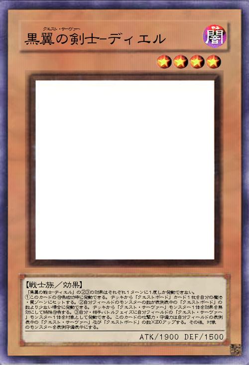 | 「黒翼の戦士-ディエル」の②③の効果はそれぞれ1ターンに1度しか発動できない。 ①このカードの召喚成功時に発動できる。デッキから「クエストボード」カード1枚を自分の魔法・罠ゾーンにセットする。②自分フィールドのモンスターの数が表側表示の「クエストボード」の数より少ない場合に発動できる。デッキから「クエスト・サーヴァー」モンスター1体を効果を無効にして特殊召喚する。③自分・相手バトルフェイズに自分フィールドの「クエスト・サーヴァー」モンスター1体を対象として発動できる。このカードの攻撃力・守備力は自分フィールドの表側表示の「クエスト・サーヴァー」及び「クエストボード」の数×200アップする。その後、対象のモンスターを表側守備表示にする。 | |||