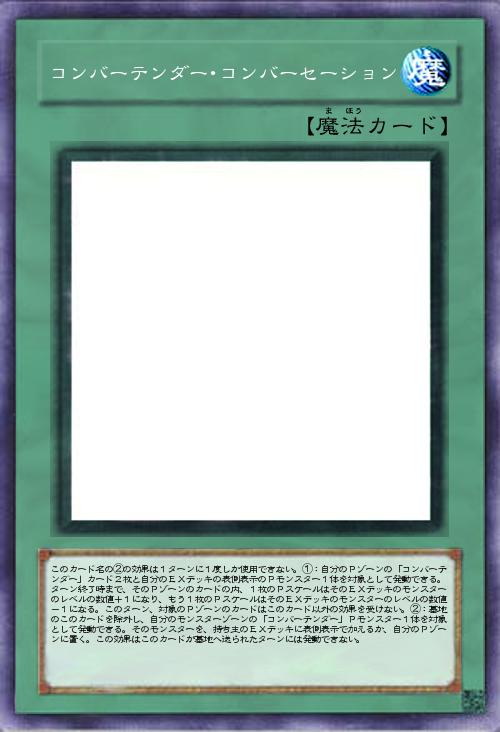 | このカード名の②の効果は1ターンに1度しか使用できない。①:自分のPゾーンの「コンバーテンダー」カード2枚と自分のEXデッキの表側表示のPモンスター1体を対象として発動できる。ターン終了時まで、そのPゾーンのカードの内、1枚のPスケールはそのEXデッキのモンスターのレベルの数値+1になり、もう1枚のPスケールはそのEXデッキのモンスターのレベルの数値-1になる。このターン、対象のPゾーンのカードはこのカード以外の効果を受けない。②:墓地のこのカードを除外し、自分のモンスターゾーンの「コンバーテンダー」Pモンスター1体を対象として発動できる。そのモンスターを、持ち主のEXデッキに表側表示で加えるか、自分のPゾーンに置く。この効果はこのカードが墓地へ送られたターンには発動できない。 | |||