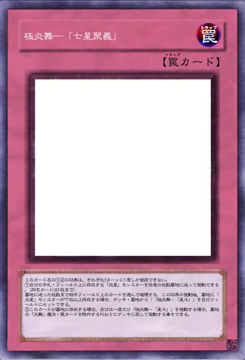 | このカード名の①②の効果は、それぞれ1ターンに1度しか使用できない。 ①自分の手札・フィールド上に存在する「炎星」モンスターを任意の枚数墓地に送って発動できる。墓地に送った枚数まで相手フィールド上のカードを選んで破壊する。この効果の発動後、墓地に「炎星」モンスターが7枚以上存在する場合、デッキ・墓地から「「極炎舞-「星斗」」を自分フィールドにセットできる。この効果でセットしたカードは、セットしたターンに発動できる。 ②このカードが墓地に存在する場合、自分は「極炎舞-「星斗」」を発動する場合、墓地の「炎舞」魔法・罠カードを7枚除外する代わりにこのカードを含む「炎舞」魔法・罠カードを任意の枚数戻して発動できる。その場合、「極炎舞-「星斗」」の効果で特殊召喚できるモンスターの数は、デッキに戻した「炎舞」魔法・罠カードの枚数までになる。 | |||