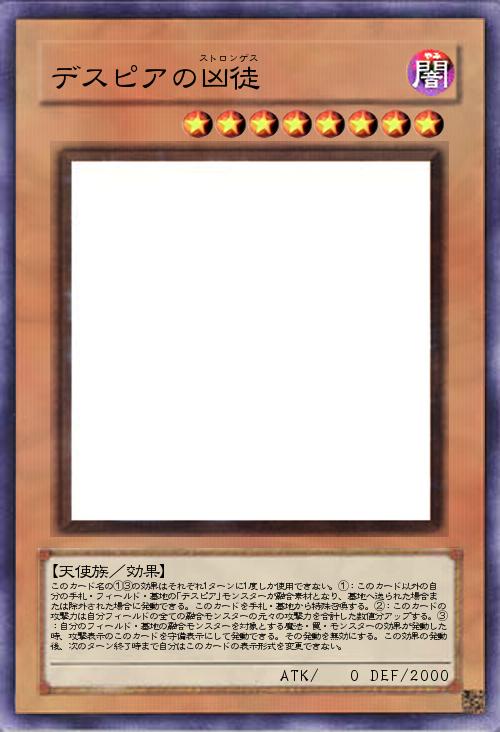 | このカード名の①③の効果はそれぞれ1ターンに1度しか使用できない。①:このカード以外の自分の手札・フィールド・墓地の「デスピア」モンスターが融合素材となり、墓地へ送られた場合または除外された場合に発動できる。このカードを手札・墓地から特殊召喚する。②:このカードの攻撃力は自分フィールドの全ての融合モンスターの元々の攻撃力を合計した数値分アップする。③:自分のフィールド・墓地の融合モンスターを対象とする魔法・罠・モンスターの効果が発動した時、攻撃表示のこのカードを守備表示にして発動できる。その発動を無効にする。この効果の発動後、次のターン終了時まで自分はこのカードの表示形式を変更できない。 | |||