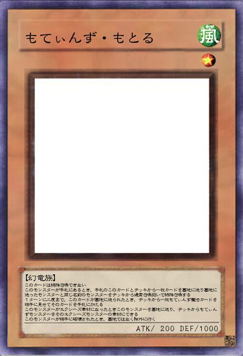 | このカードは特殊召喚できない このモンスターが手札にあるとき、手札のこのカードとデッキから一枚カードを墓地に送り墓地に送ったモンスターと同じ名前のモンスターをデッキから通常召喚扱いで特殊召喚する 1ターンに二度まで、このカードが墓地に送られたとき、デッキから一枚もてぃんず魔法カードを相手に見せてそのカードを手札に加える このモンスターがエクシーズ素材になったときこのモンスターを墓地に送り、デッキからもてぃんずモンスターをそのエクシーズモンスターの素材にできる このモンスターが相手に破壊されたとき、墓地ではなく除外に行く | |||