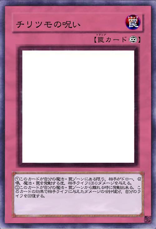 | ①このカードが自分の魔法・罠ゾーンにある限り、相手がドロー、召喚、魔法・罠を発動する度、相手ライフに50ダメージを与える。 ②このカードが自分の魔法・罠ゾーンから離れる時に発動出来る。このカードの効果で相手ライフに与えたダメージの合計値分、自分のライフを回復する。 | |||