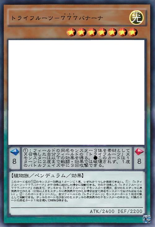 | このカード名の①②のモンスター効果は1ターンに1度、いずれか1つしか使用できない。①:「トライフルーツ-777バナーナ」がP召喚に成功した場合に発動できる。そのP召喚した「トライフルーツ-777バナーナ」の数まで、デッキから「トライフルーツ」Pモンスターを選び、自分のEXデッキに表側表示で加える(2体以上をEXデッキに表側表示で加える場合は全て同名モンスターでなければならない)。②:このカードをリリースし、自分フィールドの「トライフルーツ」モンスターカード1枚を対象として発動できる。デッキのカード及び自分のEXデッキの表側表示のPモンスターの中から、対象のカードの同名カード1枚を選んで特殊召喚する。 | |||