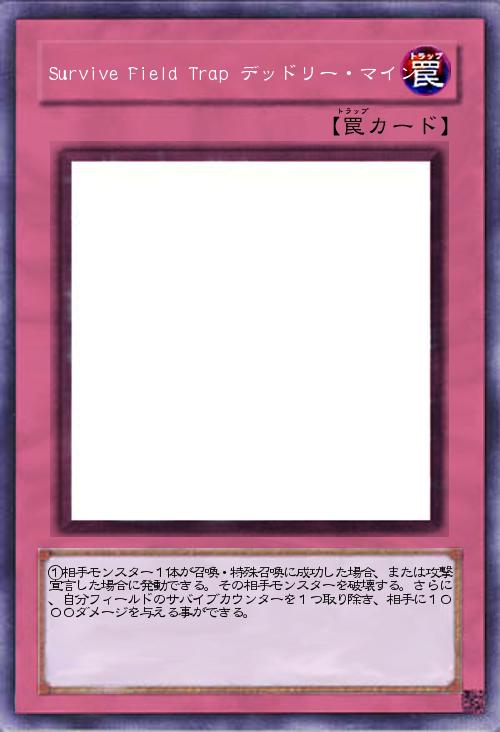 | ①相手モンスター1体が召喚・特殊召喚に成功した場合、または攻撃宣言した場合に発動できる。その相手モンスターを破壊する。さらに、自分フィールドのサバイブカウンターを1つ取り除き、相手に1000ダメージを与える事ができる。 | |||
