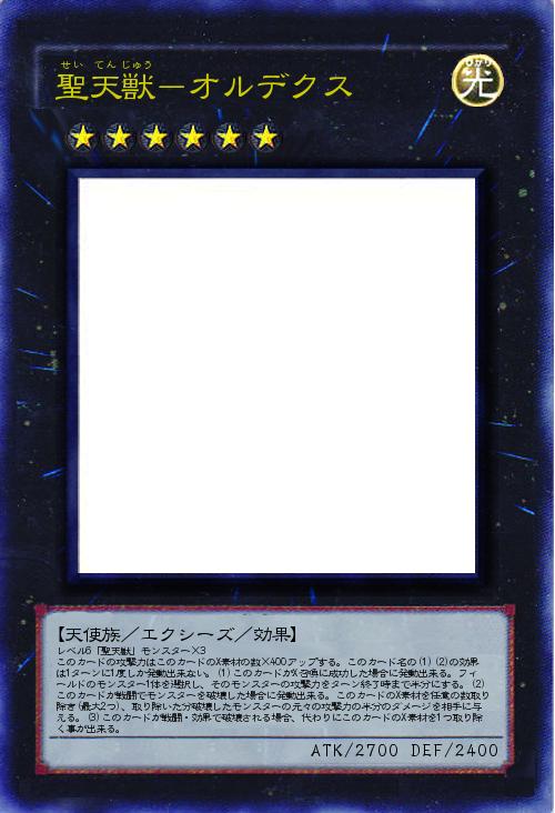 | レベル6「聖天獣」モンスター×3 このカードの攻撃力はこのカードのX素材の数×400アップする。このカード名の(1)(2)の効果は1ターンに1度しか発動出来ない。(1)このカードがX召喚に成功した場合に発動出来る。フィールドのモンスター1体を選択し、そのモンスターの攻撃力をターン終了時まで半分にする。(2)このカードが戦闘でモンスターを破壊した場合に発動出来る。このカードのX素材を任意の数取り除き(最大2つ)、取り除いた分破壊したモンスターの元々の攻撃力の半分のダメージを相手に与える。(3)このカードが戦闘・効果で破壊される場合、代わりにこのカードのX素材を1つ取り除く事が出来る。 | |||