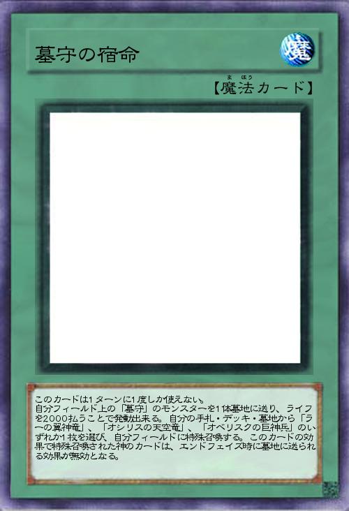 | このカードは1ターンに1度しか使えない。 自分フィールド上の「墓守」のモンスターを1体墓地に送り、ライフを2000払うことで発動出来る。自分の手札・デッキ・墓地から「ラーの翼神竜」、「オシリスの天空竜」、「オベリスクの巨神兵」のいずれか1枚を選び、自分フィールドに特殊召喚する。このカードの効果で特殊召喚された神のカードは、エンドフェイズ時に墓地に送られる効果が無効となる。 | |||