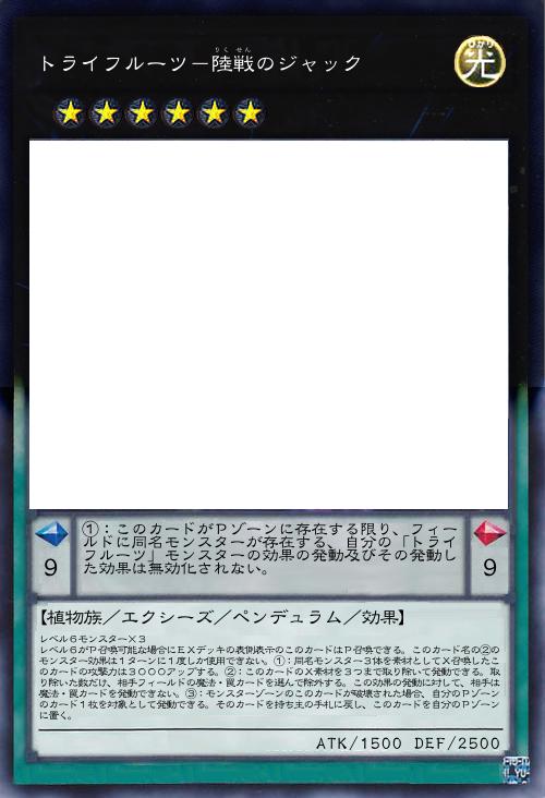 | ①:このカードがPゾーンに存在する限り、フィールドに同名モンスターが存在する、自分の「トライフルーツ」モンスターの効果の発動及びその発動した効果は無効化されない。 | |||