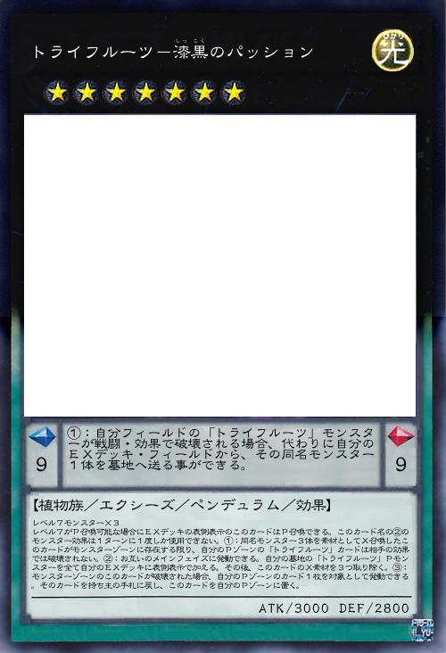 | レベル7モンスター×3 レベル7がP召喚可能な場合にEXデッキの表側表示のこのカードはP召喚できる。このカード名の②のモンスター効果は1ターンに1度しか使用できない。①:同名モンスター3体を素材としてX召喚したこのカードがモンスターゾーンに存在する限り、自分のPゾーンの「トライフルーツ」カードは相手の効果では破壊されない。②:お互いのメインフェイズに発動できる。自分の墓地の「トライフルーツ」Pモンスターを全て自分のEXデッキに表側表示で加える。その後、このカードのX素材を3つ取り除く。③:モンスターゾーンのこのカードが破壊された場合、自分のPゾーンのカード1枚を対象として発動できる。そのカードを持ち主の手札に戻し、このカードを自分のPゾーンに置く。 | |||