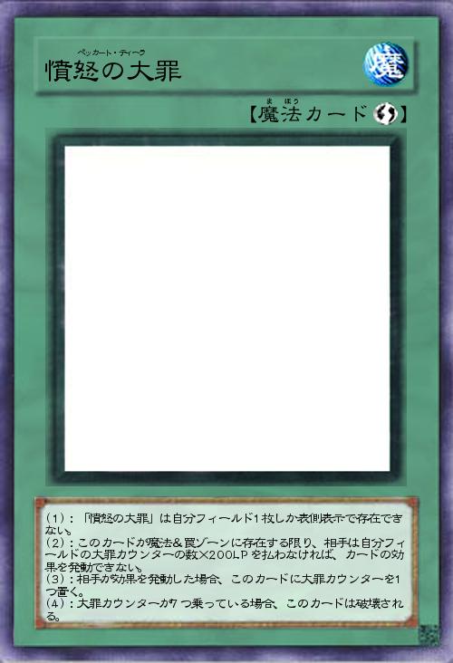 | (1):「憤怒の大罪」は自分フィールド1枚しか表側表示で存在できない。 (2):このカードが魔法&罠ゾーンに存在する限り、相手は自分フィールドの大罪カウンターの数×200LPを払わなければ、カードの効果を発動できない。 (3):相手が効果を発動した場合、このカードに大罪カウンターを1つ置く。 (4):大罪カウンターが7つ乗っている場合、このカードは破壊される。 | |||