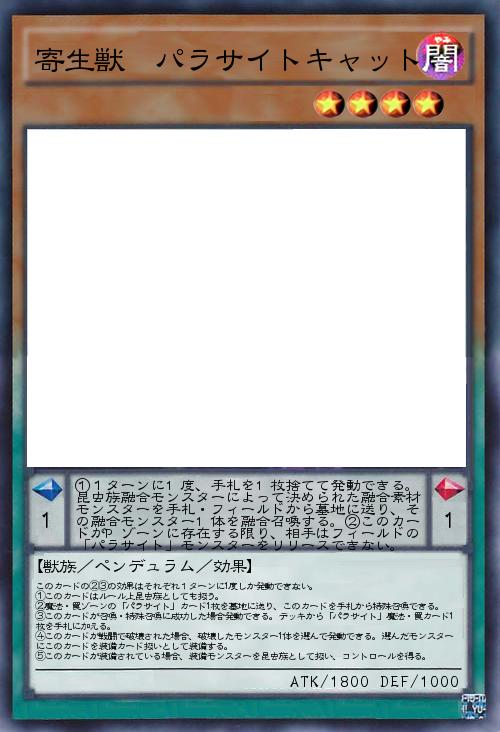 | ①1ターンに1度、手札を1枚捨てて発動できる。昆虫族融合モンスターによって決められた融合素材モンスターを手札・フィールドから墓地に送り、その融合モンスター1体を融合召喚する。②このカードがPゾーンに存在する限り、相手はフィールドの「パラサイト」モンスターをリリースできない。 | |||