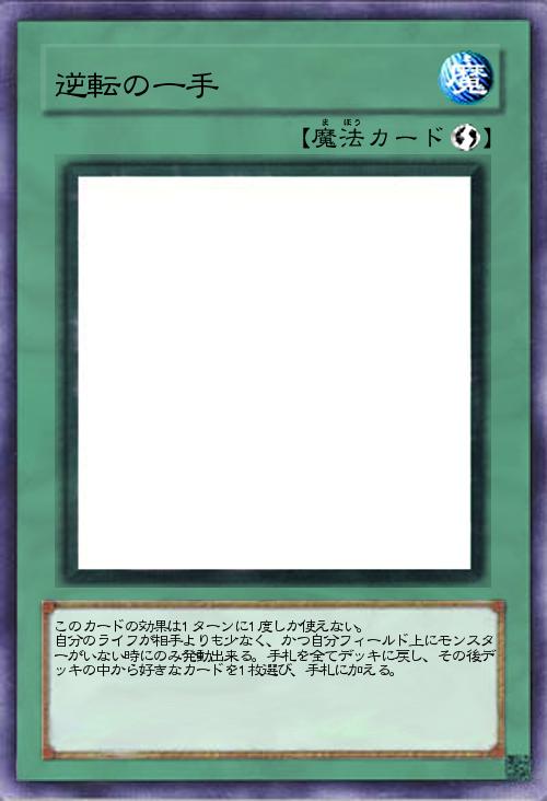 | このカードの効果は1ターンに1度しか使えない。 自分のライフが相手よりも少なく、かつ自分フィールド上にモンスターがいない時にのみ発動出来る。手札を全てデッキに戻し、その後デッキの中から好きなカードを1枚選び、手札に加える。 | |||