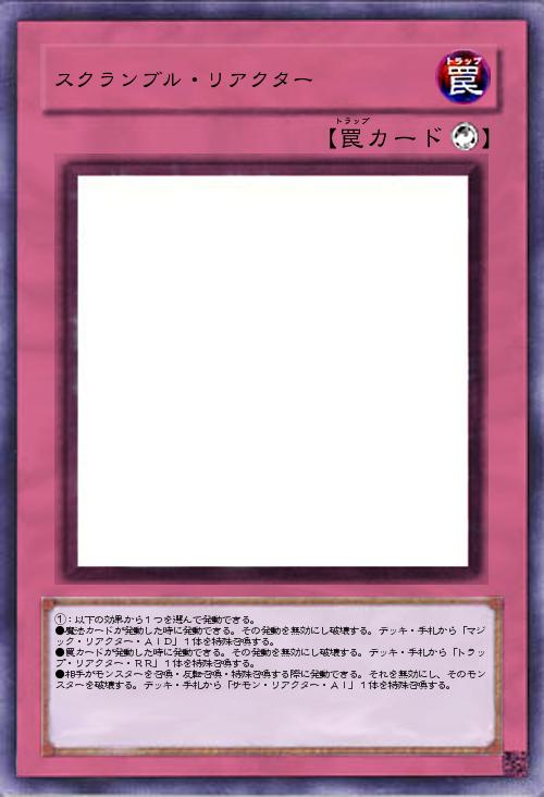 | ①:以下の効果から1つを選んで発動できる。 ●魔法カードが発動した時に発動できる。その発動を無効にし破壊する。デッキ・手札から「マジック・リアクター・AID」1体を特殊召喚する。 ●罠カードが発動した時に発動できる。その発動を無効にし破壊する。デッキ・手札から「トラップ・リアクター・RR」1体を特殊召喚する。 ●相手がモンスターを召喚・反転召喚・特殊召喚する際に発動できる。それを無効にし、そのモンスターを破壊する。デッキ・手札から「サモン・リアクター・AI」1体を特殊召喚する。 | |||