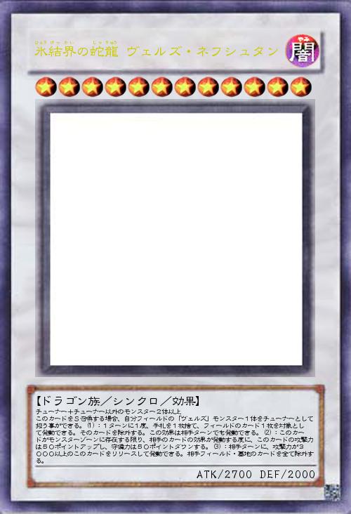 | チューナー+チューナー以外のモンスター2体以上 このカードをS召喚する場合、自分フィールドの「ヴェルズ」モンスター1体をチューナーとして扱う事ができる。(1):1ターンに1度、手札を1枚捨て、フィールドのカード1枚を対象として発動できる。そのカードを除外する。この効果は相手ターンでも発動できる。(2):このカードがモンスターゾーンに存在する限り、相手のカードの効果が発動する度に、このカードの攻撃力は50ポイントアップし、守備力は50ポイントダウンする。(3):相手ターンに、攻撃力が3000以上のこのカードをリリースして発動できる。相手フィールド・墓地のカードを全て除外する。 | |||