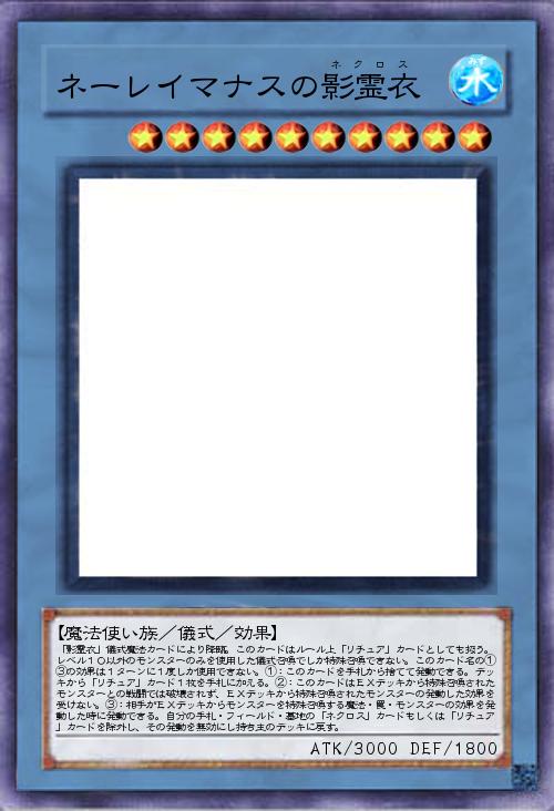 | 「影霊衣」儀式魔法カードにより降臨。このカードはルール上「リチュア」カードとしても扱う。レベル10以外のモンスターのみを使用した儀式召喚でしか特殊召喚できない。このカード名の①③の効果は1ターンに1度しか使用できない。①:このカードを手札から捨てて発動できる。デッキから「リチュア」カード1枚を手札に加える。②:このカードはEXデッキから特殊召喚されたモンスターとの戦闘では破壊されず、EXデッキから特殊召喚されたモンスターの発動した効果を受けない。③:相手がEXデッキからモンスターを特殊召喚する魔法・罠・モンスターの効果を発動した時に発動できる。自分の手札・フィールド・墓地の「ネクロス」カードもしくは「リチュア」カードを除外し、その発動を無効にし持ち主のデッキに戻す。 | |||