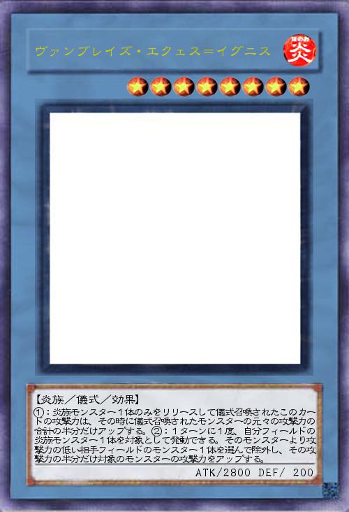 | ①:炎族モンスター1体のみをリリースして儀式召喚されたこのカードの攻撃力は、その時に儀式召喚されたモンスターの元々の攻撃力の合計の半分だけアップする。②:1ターンに1度、自分フィールドの炎族モンスター1体を対象として発動できる。そのモンスターより攻撃力の低い相手フィールドのモンスター1体を選んで除外し、その攻撃力の半分だけ対象のモンスターの攻撃力をアップする。 | |||