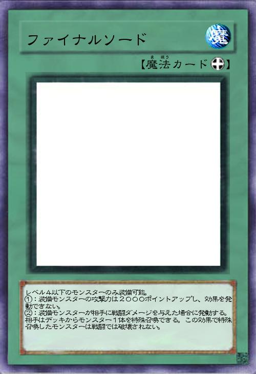 | レベル4以下のモンスターのみ装備可能。 ①:装備モンスターの攻撃力は2000ポイントアップし、効果を発動できない。 ②:装備モンスターが相手に戦闘ダメージを与えた場合に発動する。相手はデッキからモンスター1体を特殊召喚できる。この効果で特殊召喚したモンスターは戦闘では破壊されない。 | |||