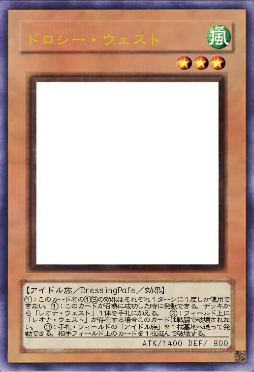 | ①:このカード名の①③の効果はそれぞれ1ターンに1度しか使用できない。①:このカードが召喚に成功した時に発動できる。デッキから「レオナ・ウェスト」1体を手札に加える。 ②:フィールド上に「レオナ・ウェスト」が存在する場合このカードは戦闘で破壊されない。 ③:手札・フィールドの「アイドル族」を1枚墓地へ送って発動できる。相手フィールド上のカードを1枚選んで破壊する。 | |||