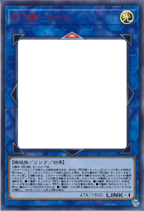 | 光属性「閃刀姫」モンスター1体 このカードはリンク召喚でしか特殊召喚できず、自分は「閃刀姫ーキャト」を1ターンに1度しか特殊召喚できない。①:このカードがリンク召喚に成功した場合、自分の墓地の「閃刀姫」モンスターを全てデッキに戻して発動できる。このカードの攻撃力はこの効果を発動するために戻したモンスターの種類×500アップする。また、この効果を発動するために戻したモンスターの種類によって以下の効果を適用する。●1種類:デッキから「閃刀」魔法カード1枚を除外する。●3種類:除外されている同名カードが自分の墓地に存在しない「閃刀」魔法カード1枚を墓地に戻す。●5種類:除外されている「閃刀」魔法カード1枚を手札に加える。●7種類:この効果を発動するために戻したモンスターから1体を選択し、そのモンスターと同じ効果を得る。 | |||