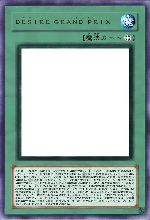 | このカード名のカードは1ターンに1枚しか発動できない。①:このカードの発動時の効果処理として、デッキから「ENTRY」1枚を手札に加える。②:自分・相手のスタンバイフェイズ開始時に、お互いのフィールドゾーンにカードが存在しない場合に発動できる。このカードを手札から発動する。③:このカードがフィールドゾーンに存在する限り、お互いにフィールド魔法カードを発動できない。④:お互いのメインフェイズ開始時に発動する。自分・相手は自身のフィールドに「ライダートークン」(戦士族・地・星4・攻/守2000)1体を攻撃表示で特殊召喚する。この効果の発動後、ターン終了時までお互いに「デザイア」モンスター以外のモンスターを召喚・特殊召喚できない。⑤:お互いのプレイヤーは1ターンに1度、自分メインフェイズに発動できる。お互いのデッキ・墓地からレベル4以下の「レイズバックル」モンスター1体を手札に加える。⑥:自分・ | |||