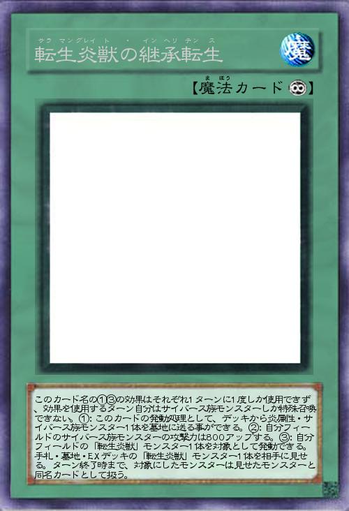 | このカード名の①③の効果はそれぞれ1ターンに1度しか使用できず、効果を使用するターン自分はサイバース族モンスターしか特殊召喚できない。①:このカードの発動処理として、デッキから炎属性・サイバース族モンスター1体を墓地に送る事ができる。②:自分フィールドのサイバース族モンスターの攻撃力は800アップする。③:自分フィールドの「転生炎獣」モンスター1体を対象として発動できる。手札・墓地・EXデッキの「転生炎獣」モンスター1体を相手に見せる。ターン終了時まで、対象にしたモンスターは見せたモンスターと同名カードとして扱う。 | |||