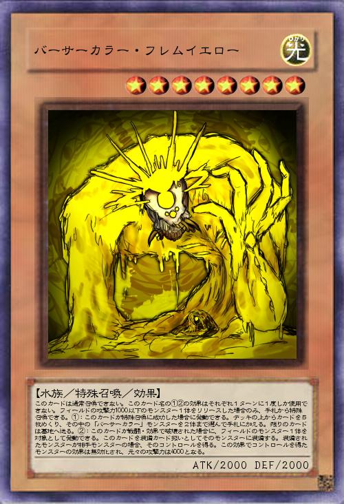 「3体目のバーサーカラーモンスター。今更ながら名前には色の名前も入れてます。フレムは英語で「痰」を意味します。効果としては戦うのがメインではなく、バーサーカラーのサーチ兼相手のコントロールを奪取すること。」(2022-10-07 02:20)