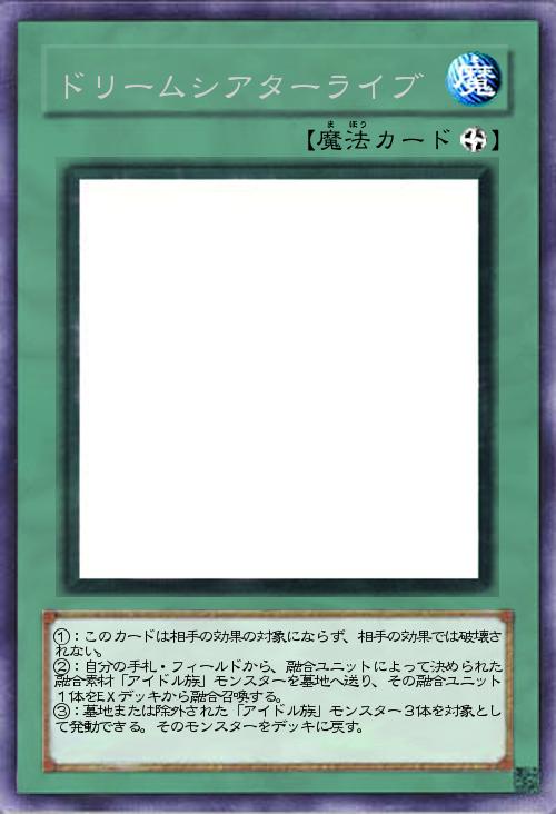 | ①:このカードは相手の効果の対象にならず、相手の効果では破壊されない。 ②:自分の手札・フィールドから、融合ユニットによって決められた融合素材「アイドル族」モンスターを墓地へ送り、その融合ユニット1体をEXデッキから融合召喚する。 ③:墓地または除外された「アイドル族」モンスター3体を対象として発動できる。そのモンスターをデッキに戻す。 | |||