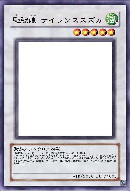 | 「駆獣娘」チューナー+チューナー以外の風属性モンスター1体以上 このカードはS召喚でしか特殊召喚できず、同名カードは自分フィールド上に1体までしか存在できない。①:1ターンに1度、このカードがS召喚に成功した場合に発動できる。自分はデッキからチューナー以外の「駆獣娘」モンスター1体、または「駆獣娘」魔法・罠カードのいずれか1枚を手札に加える。 | |||