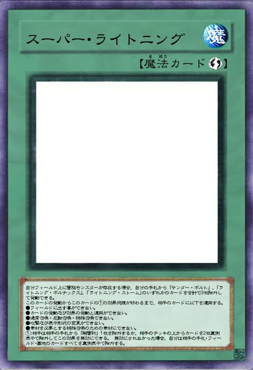 | 自分フィールド上に雷族モンスターが存在する場合、自分の手札から「サンダー・ボルト」、「ライトニング・ボルテックス」、「ライトニング・ストーム」のいずれかのカードを合計で3枚除外して発動できる。 このカードの発動からこのカードの①の効果処理が終わるまで、相手のカードに以下を適用する。 ●フィールドに出す事ができない。 ●カードの発動及び効果の発動と適用ができない。 ●通常召喚・反転召喚・特殊召喚できない。 ●攻撃及び表示形式の変更ができない。 ●素材を必要とする特殊召喚のための素材にできない。 ①:相手は相手の手札から「避雷針」1枚を除外するか、相手のデッキの上からカードを2枚裏側表示で除外してこの効果を無効にできる。 無効にされなかった場合、自分は相手の手札・フィールド・墓地のカードすべてを裏側表示で除外する。 | |||