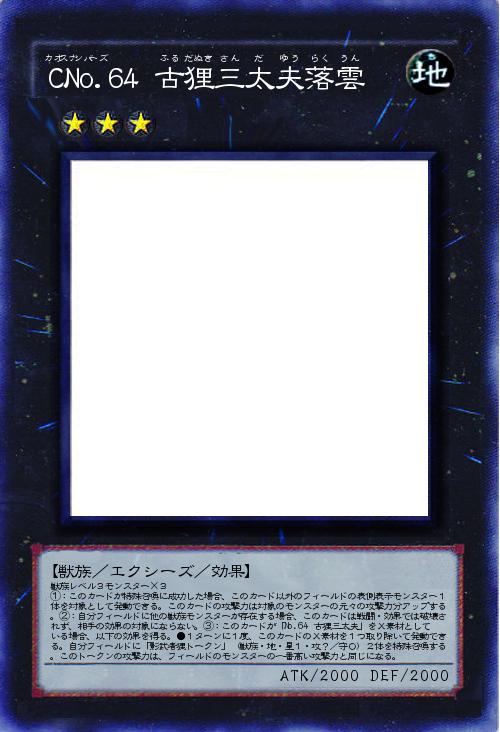 | 獣族レベル3モンスター×3 ①:このカードが特殊召喚に成功した場合、このカード以外のフィールドの表側表示モンスター1体を対象として発動できる。このカードの攻撃力は対象のモンスターの元々の攻撃力分アップする。②:自分フィールドに他の獣族モンスターが存在する場合、このカードは戦闘・効果では破壊されず、相手の効果の対象にならない。③:このカードが「No.64 古狸三太夫」をX素材としている場合、以下の効果を得る。●1ターンに1度、このカードのX素材を1つ取り除いて発動できる。自分フィールドに「影武者狸トークン」(獣族・地・星1・攻?/守0)2体を特殊召喚する。このトークンの攻撃力は、フィールドのモンスターの一番高い攻撃力と同じになる。 | |||