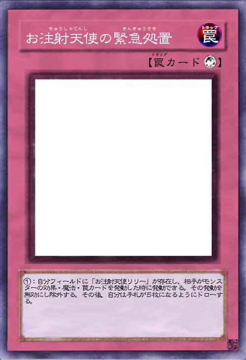 | ①:自分フィールドに「お注射天使リリー」が存在し、相手がモンスターの効果・魔法・罠カードを発動した時に発動できる。その発動を無効にし除外する。その後、自分は手札が5枚になるようにドローする。 | |||