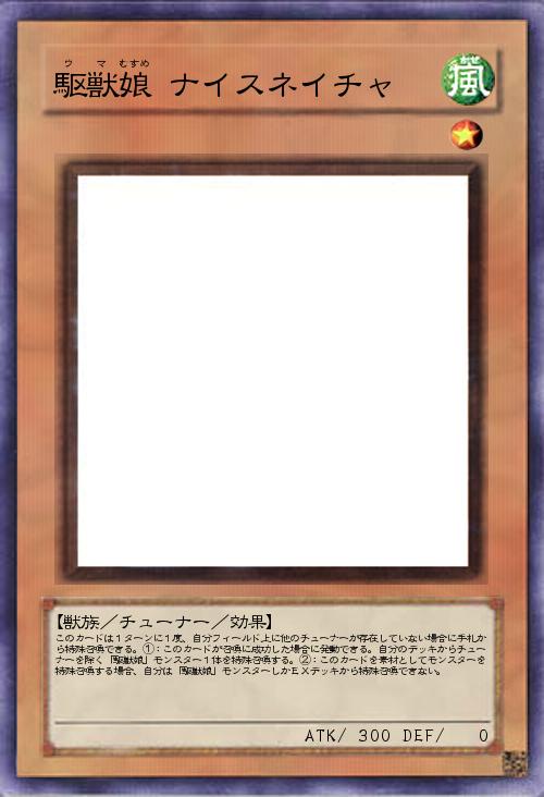 | このカードは1ターンに1度、自分フィールド上に他のチューナーが存在していない場合に手札から特殊召喚できる。①:このカードが召喚に成功した場合に発動できる。自分のデッキからチューナーを除く「駆獣娘」モンスター1体を特殊召喚する。②:このカードを素材としてモンスターを特殊召喚する場合、自分は「駆獣娘」モンスターしかEXデッキから特殊召喚できない。 | |||