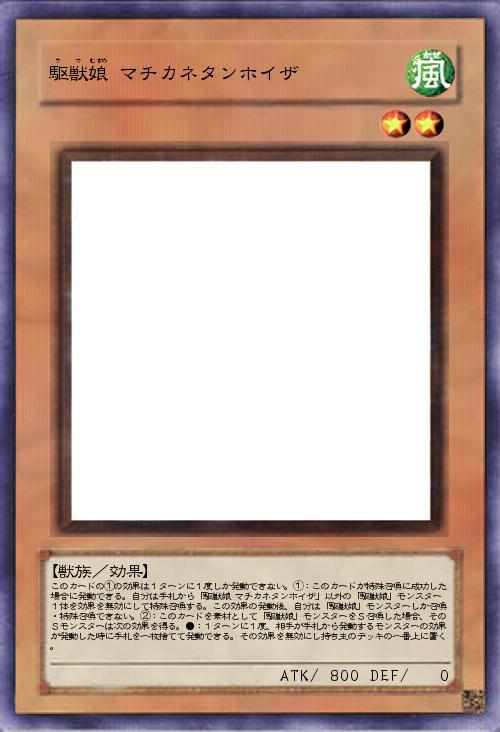 | このカードの①の効果は1ターンに1度しか発動できない。①:このカードが特殊召喚に成功した場合に発動できる。自分は手札から「駆獣娘 マチカネタンホイザ」以外の「駆獣娘」モンスター1体を効果を無効にして特殊召喚する。この効果の発動後、自分は「駆獣娘」モンスターしか召喚・特殊召喚できない。②:このカードを素材として「駆獣娘」モンスターをS召喚した場合、そのSモンスターは次の効果を得る。●:1ターンに1度、相手が手札から発動するモンスターの効果が発動した時に手札を一枚捨てて発動できる。その効果を無効にし持ち主のデッキの一番上に置く。 | |||