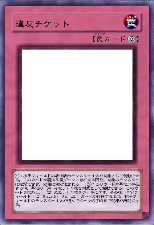 | ①:相手フィールドの表側表示モンスター1体を対象として発動できる。このカードが魔法&罠ゾーンに存在する限り、対象のモンスターは攻撃できず、効果は無効化される。 ②:このカードが墓地に存在する時、墓地の「南 みれぃ」1枚を対象として発動できる。このカードを除外し、「南 みれぃ」1枚をデッキに戻す。その後、自分フィールド上に「SoLaMi SMILE」カードが存在する場合、相手フィールドのモンスター1体を選んでターン終了時まで効果を無効にする。 | |||
