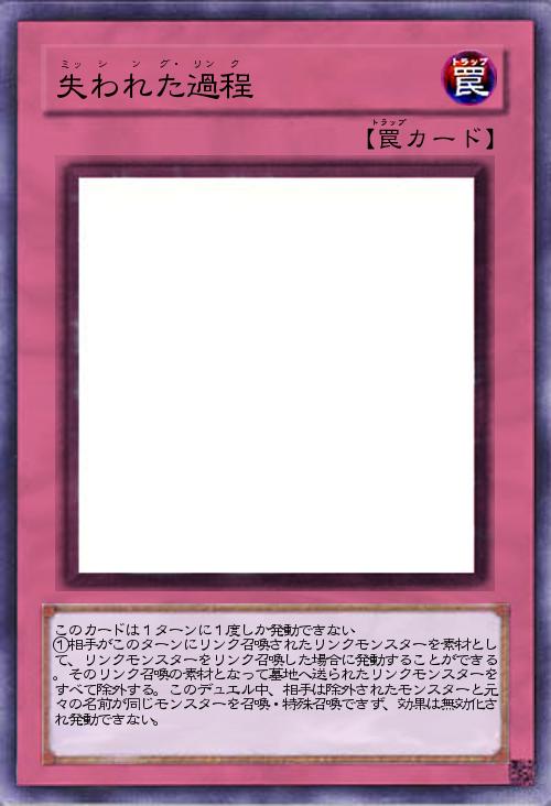 | このカードは1ターンに1度しか発動できない ①相手がこのターンにリンク召喚されたリンクモンスターを素材として、リンクモンスターをリンク召喚した場合に発動することができる。そのリンク召喚の素材となって墓地へ送られたリンクモンスターをすべて除外する。このデュエル中、相手は除外されたモンスターと元々の名前が同じモンスターを召喚・特殊召喚できず、効果は無効化され発動できない。 | |||