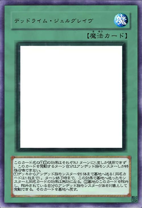 | このカード名の①②の効果はそれぞれ1ターンに1度しか使用できず、このカードを発動するターン自分はアンデッド族モンスターしか特殊召喚できない。 ①デッキからアンデッド族モンスターを5体まで墓地へ送る(同名カードは1枚まで)。ターン終了時まで、この効果で墓地へ送ったモンスターと同名カードの効果は無効になる。②墓地のこのカードを除外し、除外されている自分のアンデッド族モンスター3体を対象として発動できる。そのカードを墓地へ戻す。 | |||