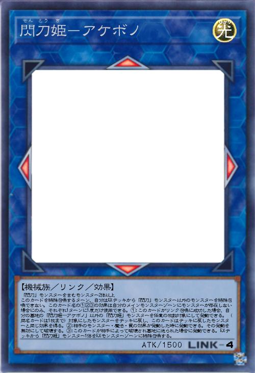 | 「閃刀」モンスターを含むモンスター2体以上 このカードを特殊召喚するターン、自分はEXデッキから「閃刀」モンスター以外のモンスターを特殊召喚できない。このカード名の①②③の効果は自分のメインモンスターゾーンにモンスターが存在しない場合にのみ、それぞれ1ターンに1度だけ使用できる。①:このカードがリンク召喚に成功した場合、自分の墓地の「閃刀姫―アケボノ」以外の「閃刀姫」モンスターを任意の枚数対象にして発動できる。(同名カードは1枚まで)対象にしたモンスターをデッキに戻し、このカードはデッキに戻したモンスターと同じ効果を得る。②:相手のモンスター・魔法・罠の効果が発動した時に発動できる。その発動を無効にして破壊する。③:このカードが相手によって破壊され墓地に送られた場合に発動できる。EXデッキから「閃刀姫」モンスター1体をEXモンスターゾーンに特殊召喚する。 | |||