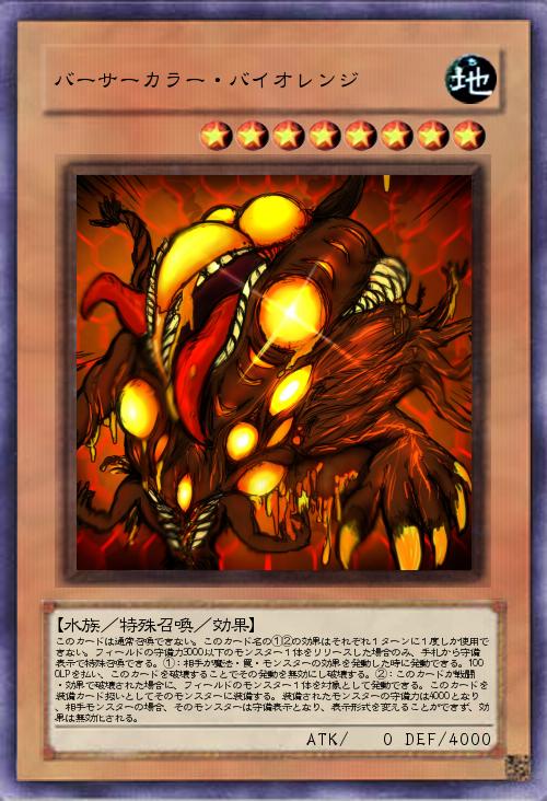 「5体目のバーサーカラーモンスター。前回本当に眠たかった。魔法罠含めてあと6枚ほど作れればと思います。効果無効は自壊して肉片によって防がれる感じで。名前はバイオ・オレンジから。バイオの名のように装備で相手にバイオレンジが取りつき行動妨害を起こす感じで。前回のシュロスグリンは、シュロスグリーンという塗料から。あとバーサーカラーのEX枠2体も書く予定。」(2022-10-14 18:08)