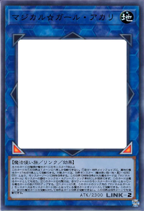 | 元々のカードの種類が魔法カードのモンスター1体以上 このカードの①の効果は1ターンに一度しか発動できない。①自分・相手メインフェイズに、墓地の魔法カード1枚を対象として発動できる。対象カードは、効果モンスター(魔法使い族・地・星3・攻守2000)となり、モンスターゾーンに特殊召喚する。この効果で特殊召喚された魔法カードは「マジカル☆ガール」モンスターの融合・シンクロ・エクシーズ・リンク素材にしか使用できず、このカードは魔法カードとしても扱う。②このカードの攻撃力は、自分フィールドのモンスターカード扱いとなっている魔法カードの数×1000アップする。③1ターンに1度、このカードのリンク先の「マジカル☆ガール」モンスター又はモンスターカード扱いとなっている魔法カードをリリースして発動できる。このターン、自分の魔法カードの発動に対して相手はカード効果を発動できない。この効果は相手ターンでも発動で | |||