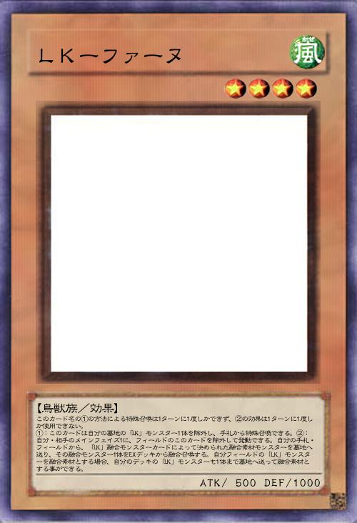 | このカード名の①の方法による特殊召喚は1ターンに1度しかできず、②の効果は1ターンに1度しか使用できない。 ①:このカードは自分の墓地の「LK」モンスター1体を除外し、手札から特殊召喚できる。②:自分・相手のメインフェイズ1に、フィールドのこのカードを除外して発動できる。自分の手札・フィールドから、「LK」融合モンスターカードによって決められた融合素材モンスターを墓地へ送り、その融合モンスター1体をEXデッキから融合召喚する。自分フィールドの「LK」モンスターを融合素材とする場合、自分のデッキの「LK」モンスターも1体まで墓地へ送って融合素材とする事ができる。 | |||