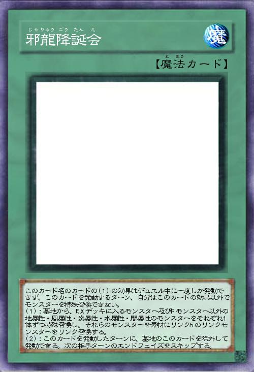 | このカード名のカードの(1)の効果はデュエル中に一度しか発動できず、このカードを発動するターン、自分はこのカードの効果以外でモンスターを特殊召喚できない。 (1):墓地から、EXデッキに入るモンスター及びPモンスター以外の地属性・風属性・炎属性・水属性・闇属性のモンスターをそれぞれ1体ずつ特殊召喚し、それらのモンスターを素材にリンク5のリンクモンスターをリンク召喚する。 (2):このカードを発動したターンに、墓地のこのカードを除外して発動できる。次の相手ターンのエンドフェイズをスキップする。 | |||