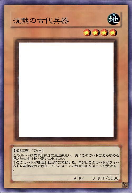 | このカードは表示形式を変更出来ない。更にこのカードはあらゆる召喚方法の生け贄・素材に出来ない。 ①このカードが破壊された時に発動する。自分はこのカードがフィールドに表側表示で存在していたターンの数×500ダメージを受ける。 | |||