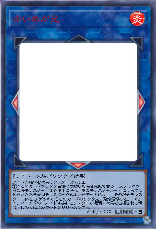 | アイドル族含む効果モンスター2体以上 ①:このカードがリンク召喚に成功した場合発動できる。EXデッキから融合モンスター1体を相手に見せ、そのモンスターカードによって決められた融合素材モンスターを墓地からデッキに戻し、その融合モンスター1体をEXデッキからこのカードのリンク先に融合召喚する。 ②:フィールドの「アイドル族」モンスターが戦闘・効果で破壊される場合、代わりにこのカードをリリースできる。 | |||