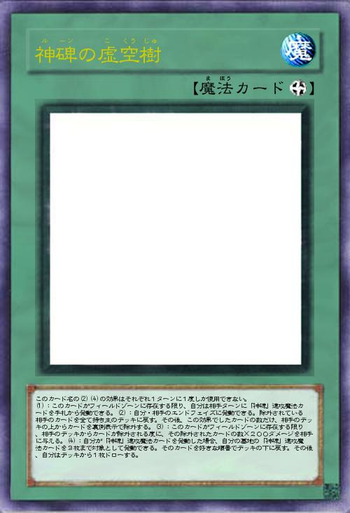 | このカード名の(2)(4)の効果はそれぞれ1ターンに1度しか使用できない。 (1):このカードがフィールドゾーンに存在する限り、自分は相手ターンに「神碑」速攻魔法カードを手札から発動できる。(2):自分・相手のエンドフェイズに発動できる。除外されている相手のカードを全て持ち主のデッキに戻す。その後、この効果でしたカードの数だけ、相手のデッキの上からカードを裏側表示で除外する。(3):このカードがフィールドゾーンに存在する限り、相手のデッキからカードが除外される度に、その除外されたカードの数×200ダメージを相手に与える。(4):自分が「神碑」速攻魔法カードを発動した場合、自分の墓地の「神碑」速攻魔法カードを3枚まで対象として発動できる。そのカードを好きな順番でデッキの下に戻す。その後、自分はデッキから1枚ドローする。 | |||